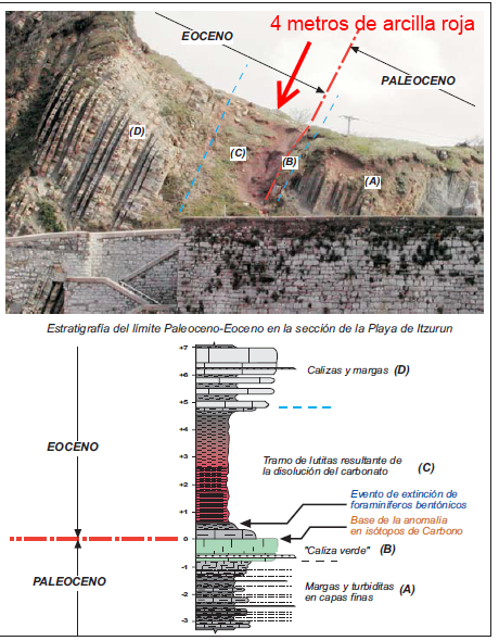Pero lejos de toda teoría geoquímica la observación visual de los estratos ya nos indica que en aquel momento paso algo ‘gordo’. De repente desaparecen los estratos carbonatados (duros) y lo que queda son unos 4 m de arcilla roja que se ablanda y que se reconoce fácilmente desde la playa. La ausencia de carbonato indica que los esqueletos de determinados micro-organismos se disolvieron en una océano ácido, acidificado por los niveles de CO2 muy elevados, parece. Estos estratos de Zumaia son ahora reconocido como los estratos tipo donde se conservaron mejor y más completo sus rasgos y son así una referencia mundial…