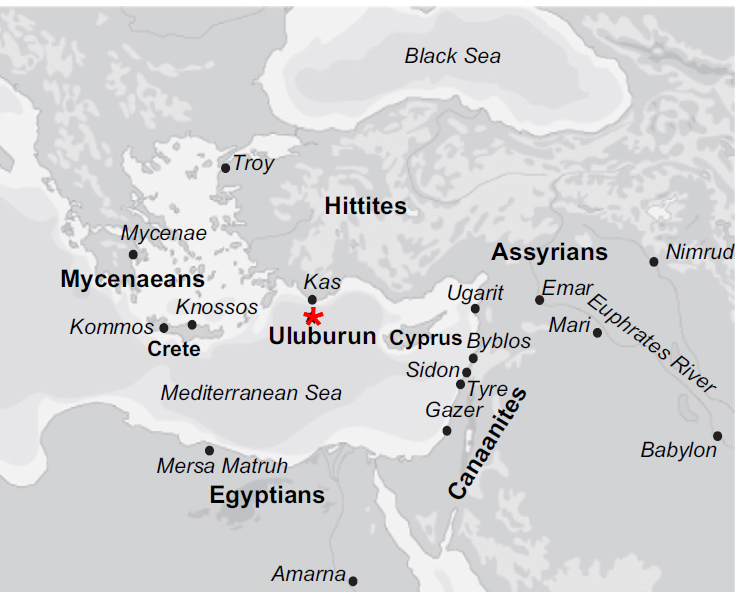 El pecio de Uluburun data de la edad de bronce tardía y fue descubierto en el Mar Mediterráneo en una zona rocosa entre 44 u 52 m de profundidad en la costa del sur de Turquia, cerca de la ciudad de Kas, en la provincia de Antalya. El pecio de Uluburun es el barco más antiguo que fue excavado con técnicas modernas de arqueología submarina. La madera fue datado por medio de dendrochronología, aunque con dificultades debidos a la mala conservación, en ca. 1327 +4/-7
