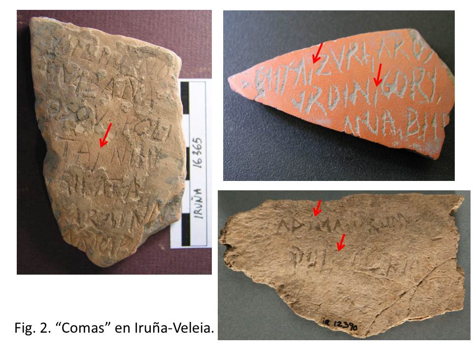 En la figura 1 se muestra una inscripción latina de época antigua con “comas”, en realidad signos de interpunción parecidos a comas, que parten de la altura media de la caja de escritura. Estas “comas” son similares a otras observadas en grafitos de Iruña-Veleia que también parten de la altura media de la caja (Fig. 2) (señaladas con flechas), y no del borde inferior de la misma, como las comas