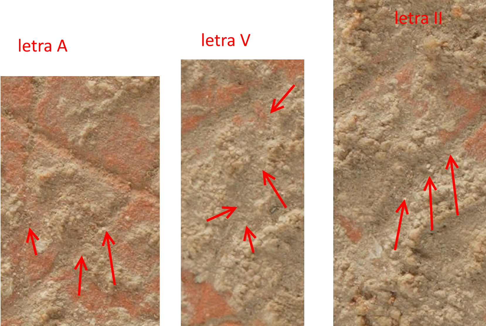 El ladrillo, como es habitual en el material constructivo de época romana, presentaba una buena capa de adherencias superficiales, si bien, como para esas fechas ya habíamos encontrado los conjuntos de grafitos excepcionales (con lo que estábamos especialmente expectantes a la posible aparición de más material de este tipo) al observar en detalle la pieza nos dimos cuenta de que parecía tener algo inciso debajo de dichas adherencias, que era imposible de distinguir sin una limpieza. Por ello el ladrillo fue enviado al Servicio de Restauración de la DFA para su procesamiento. Durante el mismo, llevado a cabo por las técnicos del Servicio, se descubrió un nuevo grafito que presentamos aquí.” [24].