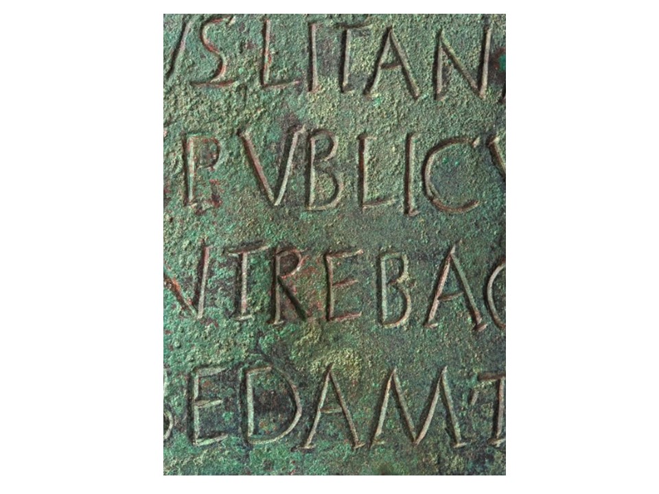3) El Bronce de Novallas (Zaragoza), con una palabra latina, PVBLICVS, en medio de un texto celtíbero. También en 2012 se dio a conocer el hallazgo del “Bronce de Novallas”, en la provincia de Zaragoza, que contiene un texto en una lengua indígena paleohispánica, probablemente celtíbero, escrito con letras latinas, en medio del cual aparece la palabra latina PVBLICVS [6] (Fig. 3), con evidentes paralelos con los grafitos en lengua vasca de Iruña-Veleia que contienen palabras latinas insertadas en el texto, como polita, cor, nova, o vola(t) [7] (Fig. 4-6).