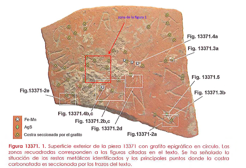 «Aún más importante, la presencia de metales inalterados no constituye la única evidencia de una ejecución reciente de los grafitos. Las piezas arqueológicas han permanecido siglos enterradas y eso las cubre de costras y depósitos que afectan por igual a toda la superficie, también a las marcas de textos o dibujos (grafitos) sobre las piezas. Si el trazo de éstos secciona las costras o depósitos de sedimentos es que no datan del tiempo del enterramiento, sino que se han ejecutado después de desenterrados. No hay que ser especialista para concluir de esta manera, pues es de sentido común.»