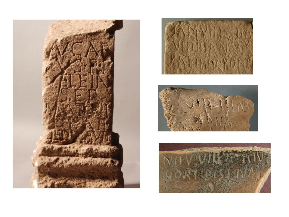 Fig. 8. Inscripción en un ara hallada en Iruña-Veleia por el equipo de Julio Núñez con la palabra VELEIAN(ORVM?) (“de los veleianos”) (izda.) y tres grafitos hallados por el equipo de Eliseo Gil con el nombre VIILIIIA (dcha.).