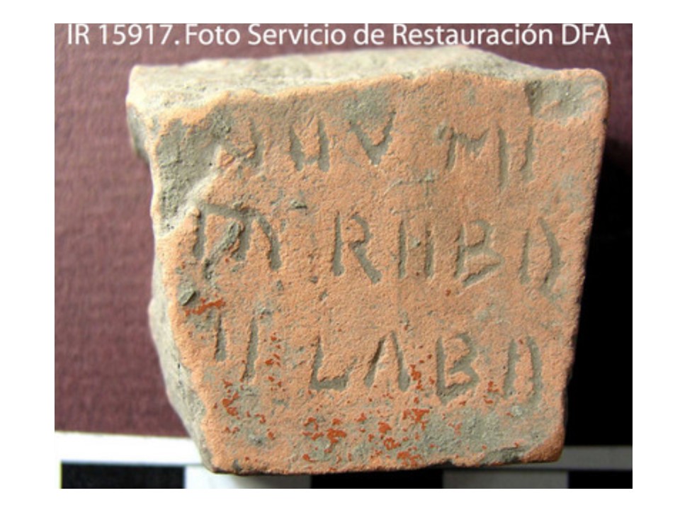 Fig. 15. Pieza 15917 de Iruña-Veleia con los nombres vascos de parentesco RIIBA y LABA. El II a la izquierda de LABA está separado por un espacio y podría indicar el numeral romano II: “dos hijas”.