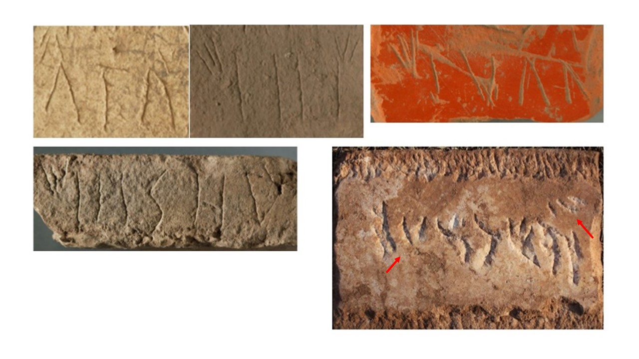 Fig. 1. Arriba y abajo izda.: “Comillas” triples en cuatro grafitos de Iruña-Veleia (piezas 13361, 13383, 13336 y 13385) enmarcando las palabras ATA, FILI, IVAN y IIISHV. Abajo dcha.: inscripción hebrea de Silves (Portugal) con «comillas» triples enmarcando un nombre, interpretado como Yehiel en hebreo.